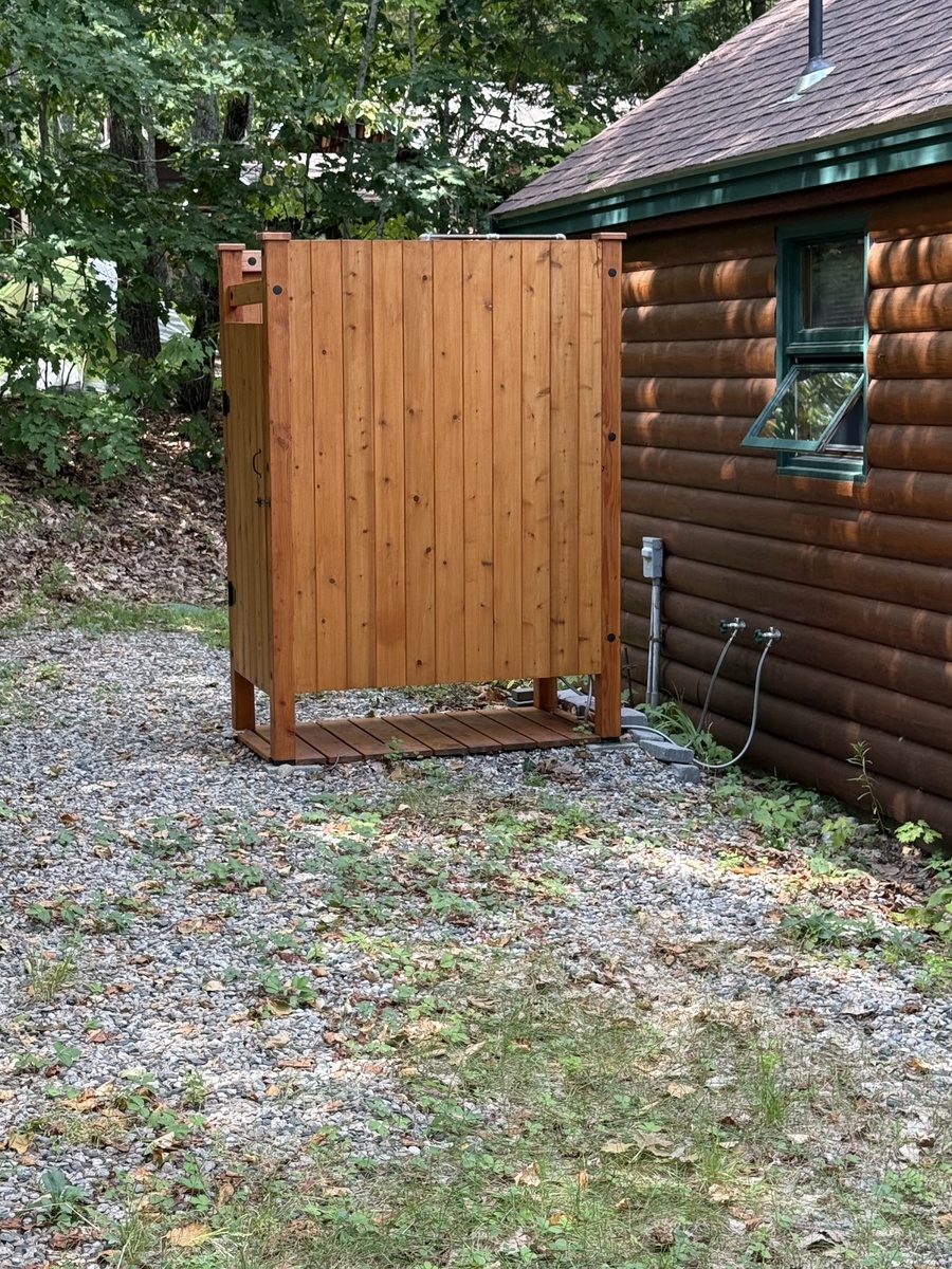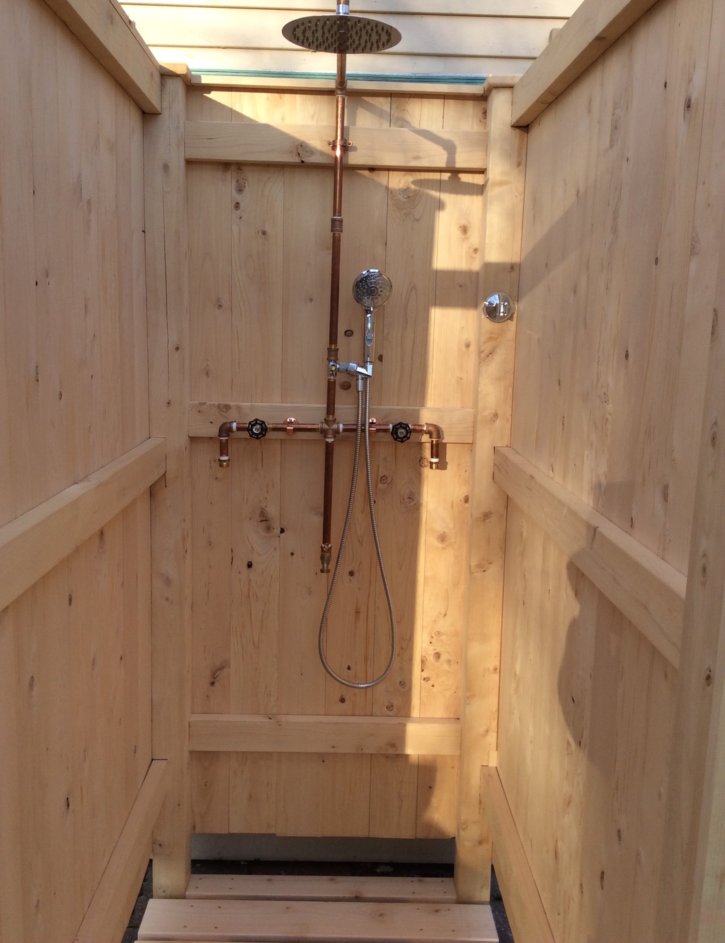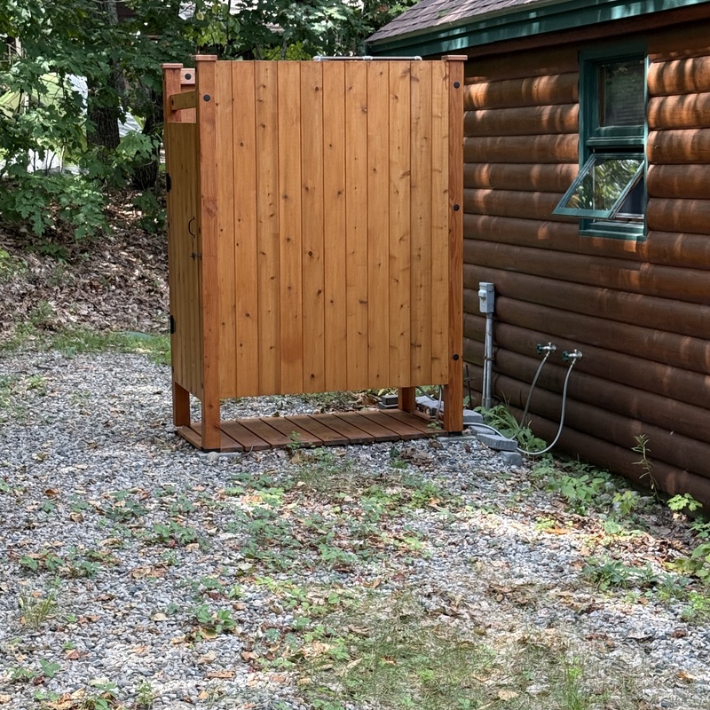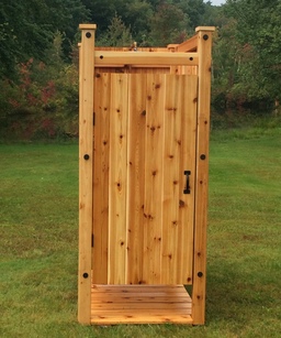 Our outdoor showers are custom made shower rooms that will transform your beach house, lake house or main house into a natural shower experience. Shower kits comes with (4) walls/sides, floor and door with lock. Standard shower piping heavy duty brass and includes shower wand. Piping connects to house HOT and cold water system via hoses (not included). All showers are made from sustainable cedar and douglas fir. All hardware included makes for easy assembly.